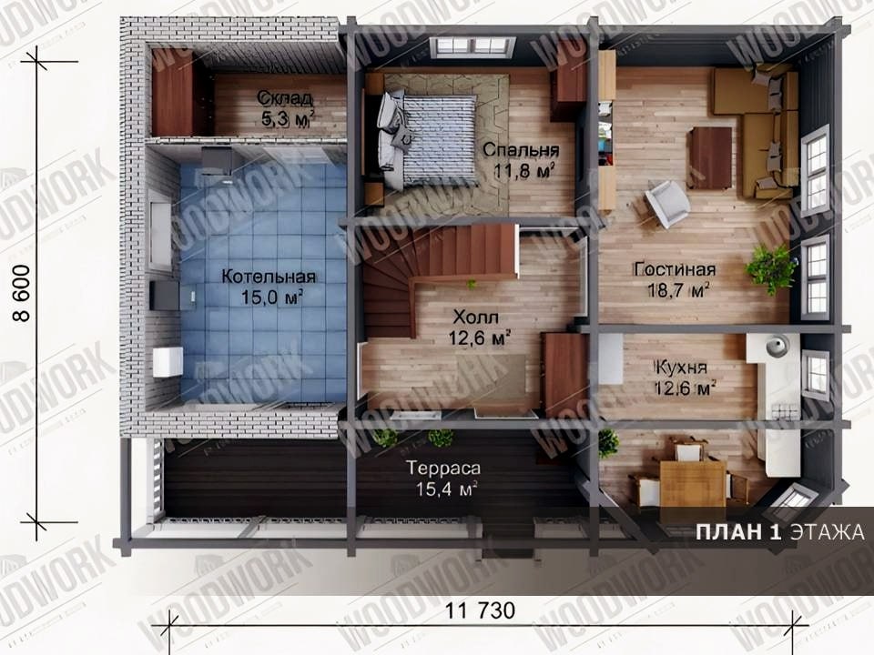 ОСОБЕННОСТЬданного проекта в том, что для бОльшей безопасности СТЕНЫ котельной и складского помещения выполнены ИЗ КИРПИЧА, которые пристроены к основному дому.